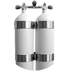 All twinsets will be 2x 12 L with a isolation manifold (sorry, no twin x 10 L cylinders available). There are no ‘slob knobs’. The stainless steel twining bands have an 11″ spacing between the bolts to allow a standard back plate to fit. There will be no major adjustments allowed. They are not strictly DIR compliant (they are as ‘good as’ without opening a whole can of worms) but will allow a standard Hogarthian rig to be assembled. You need to bring your own harness, back plate and wing.