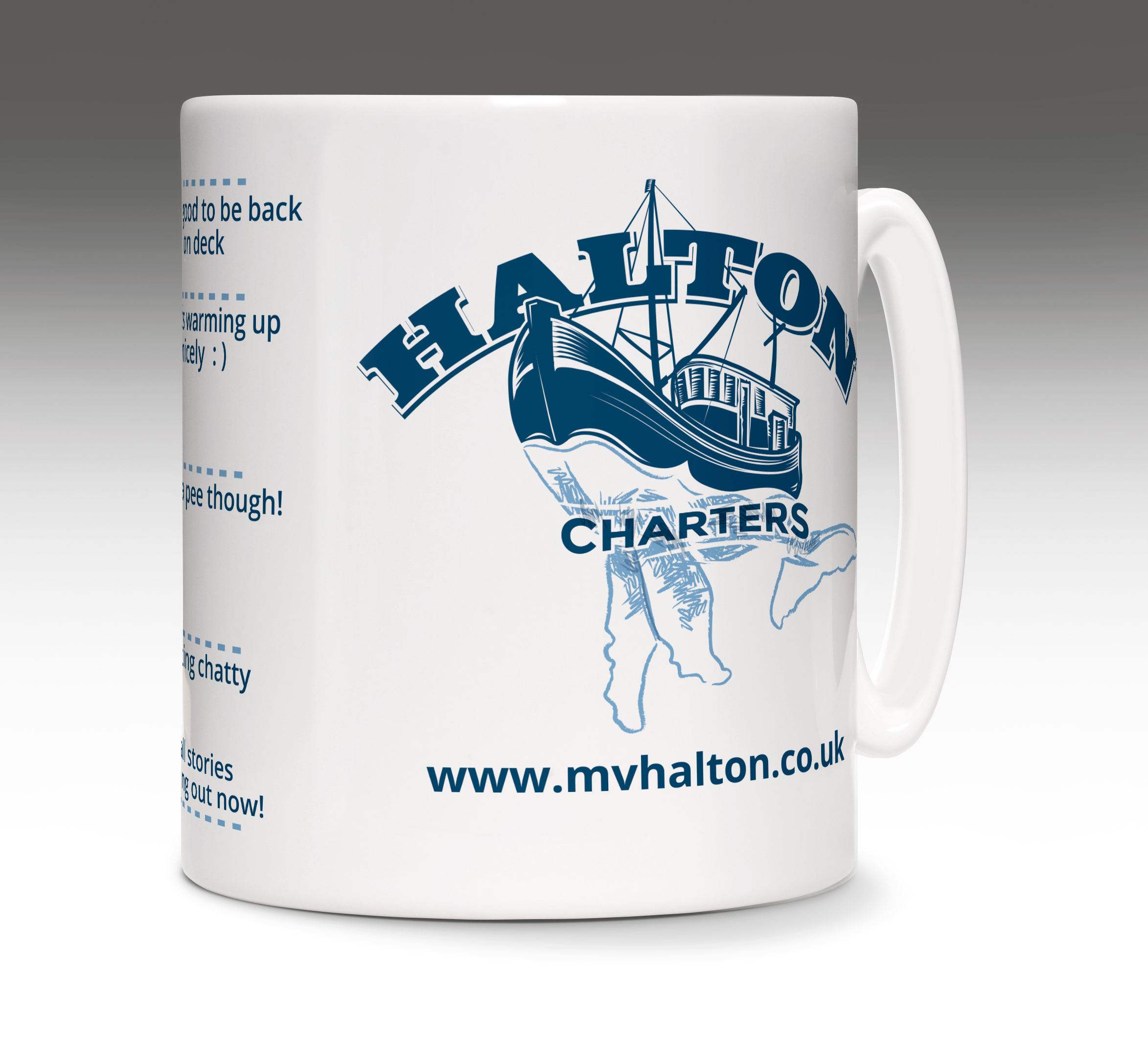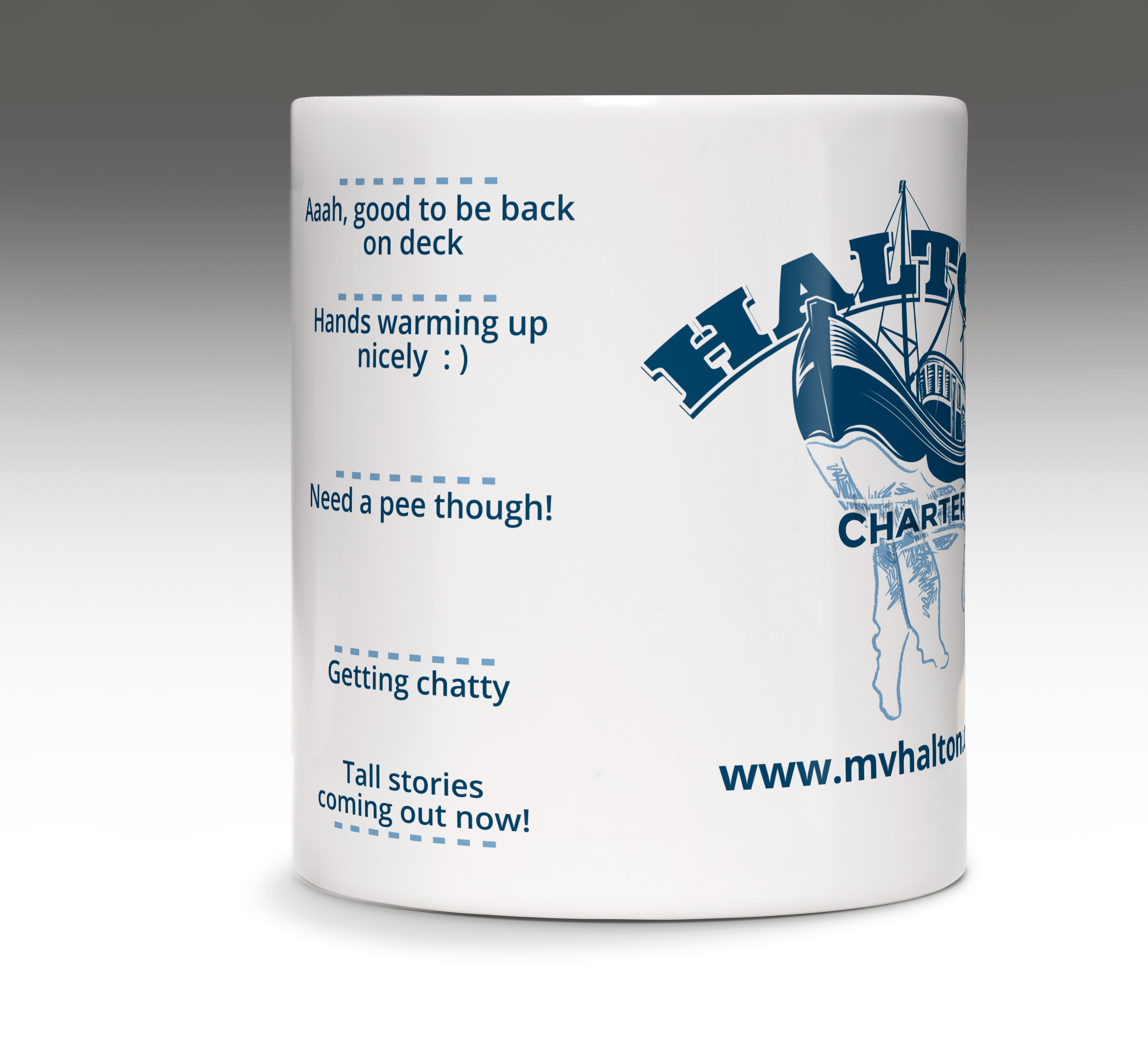 Halton branded mug with ‘Duck Feet’ logo on front and ‘whale’ logo on back. The side has a tea depth gauge which measures your warming progress as you finish your post dive cuppa!