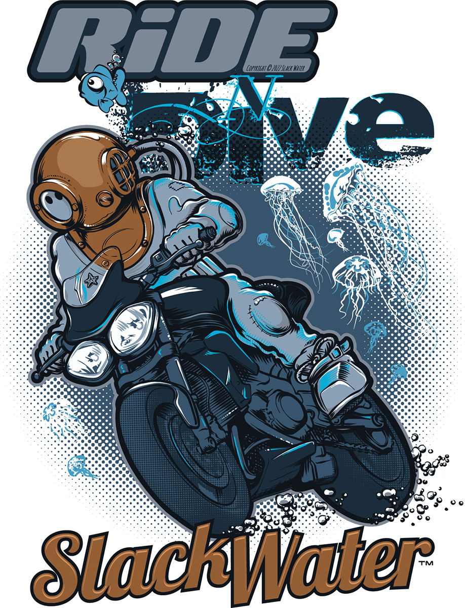 The front design features an original illustration from Steve Jakeway of a standard diver riding a motorbike! The back, nape of neck has the ‘Slack Water’ branding with the brands farting fish.