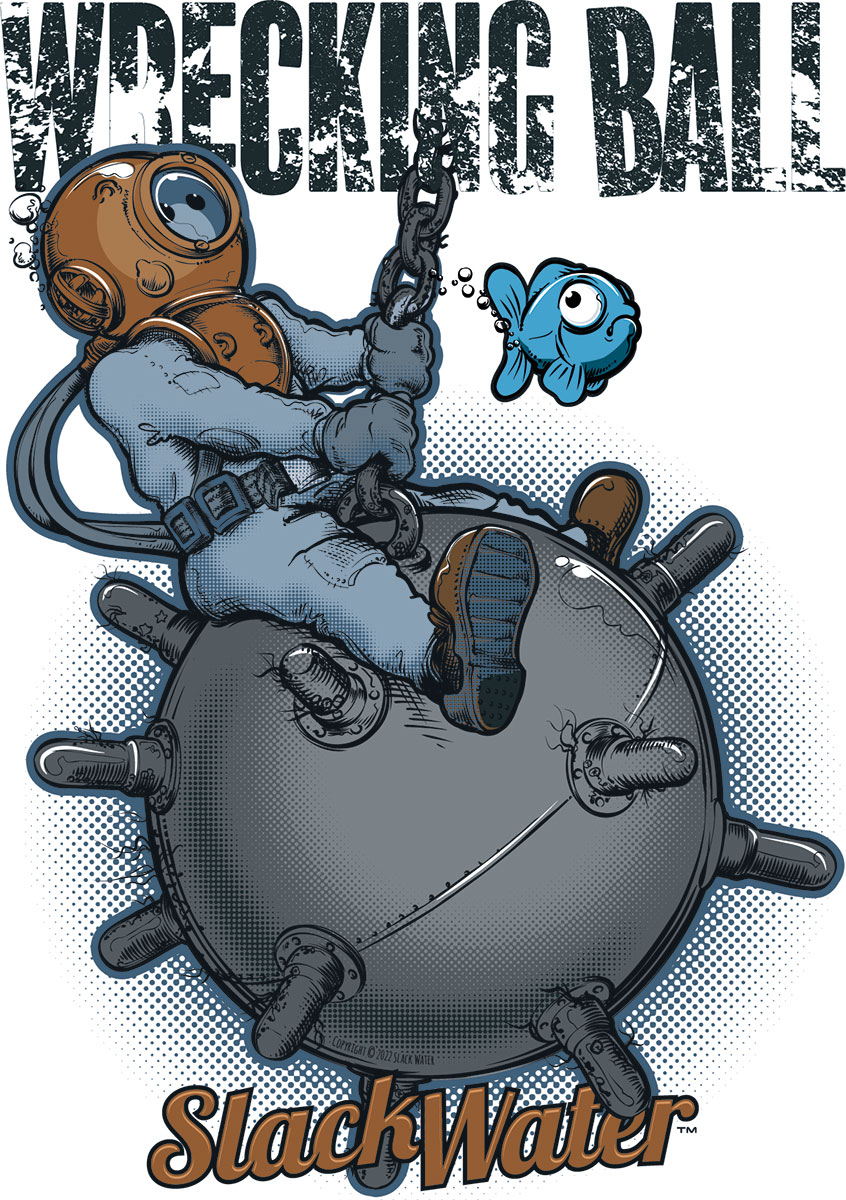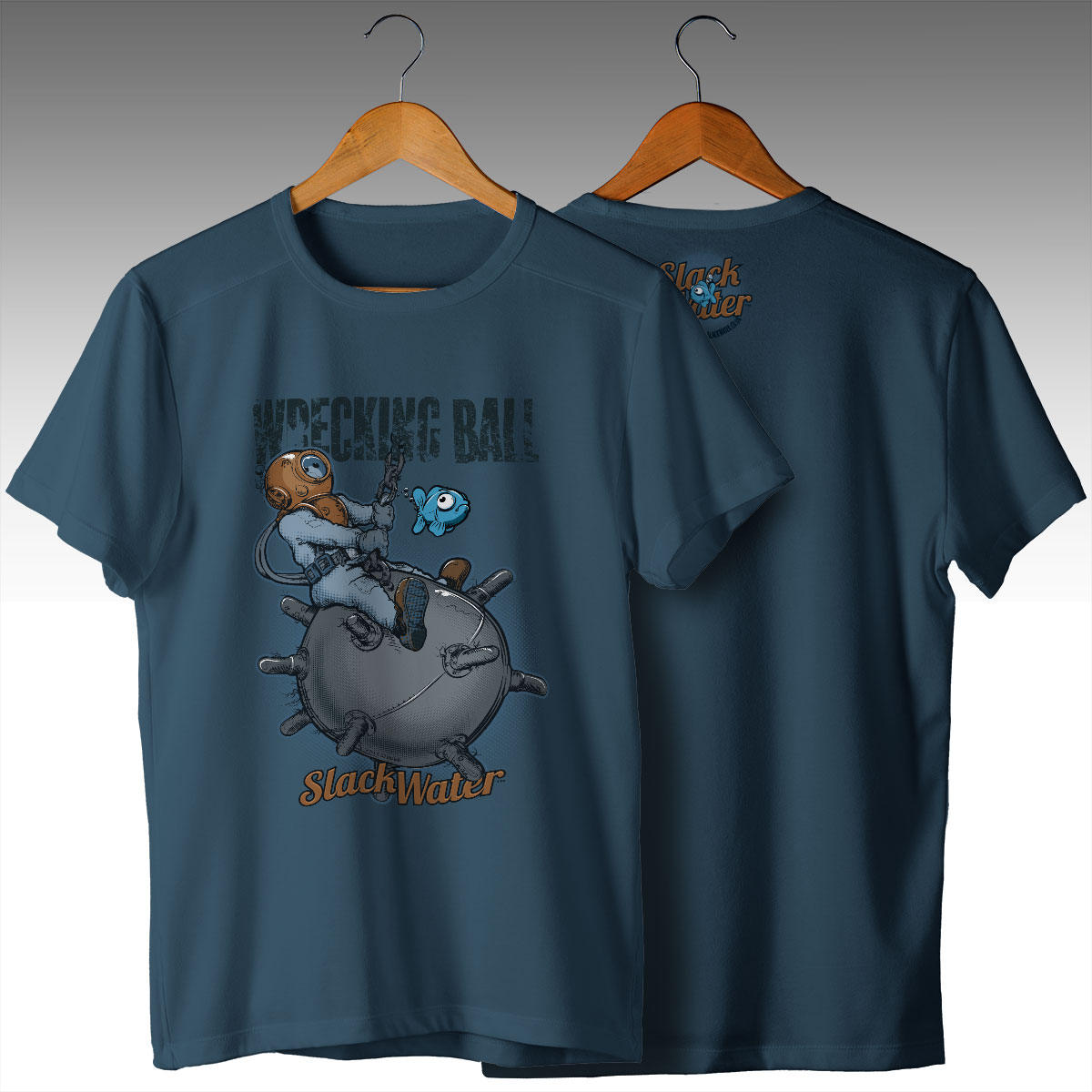 The front design features an original illustration from Steve Jakeway of a standard diver swinging on a sea mine! The back, nape of neck has the ‘Slack Water’ branding with the brands farting fish.